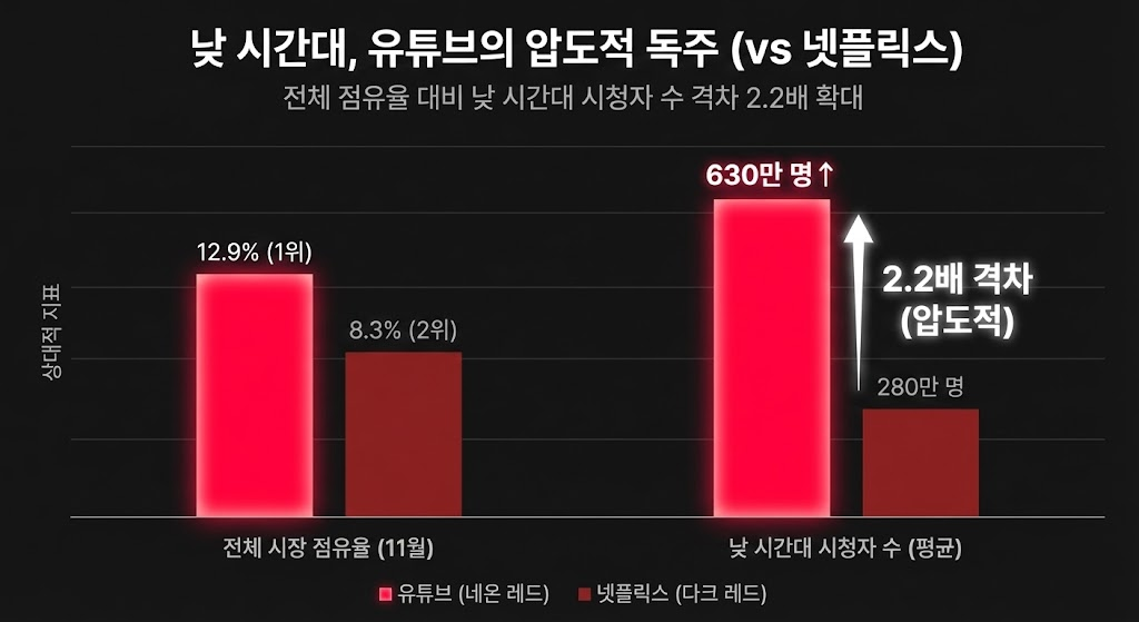 ๋ฎ ์๊ฐ๋ ์์ฒญ์ 630๋ง ๋ช ํ๋ณดํ ์ ํ๋ธ, ๋ทํ๋ฆญ์ค ๋๋น 2.2๋ฐฐ ๊ฒฉ์ฐจ ๋ฒ๋ ค ํ๋ซํผ๋ณ ๊ฒฝ์๋ ฅ์์๋ ์ ํ๋ธ์ ๋ ์ฃผ๊ฐ ๋๋๋ฌ์ง๋ค. ํนํ ๋ฎ ์๊ฐ๋ ์ ํ๋ธ์ ํ๊ท ์์ฒญ์ ์๋ 630๋ง ๋ช ์ ๊ธฐ๋กํ๋ฉฐ 280๋ง ๋ช ์ ๊ทธ์น ๋ทํ๋ฆญ์ค๋ฅผ 2.2๋ฐฐ ์ด์ ์์ง๋ ๋ค. ์ด๋ ์ ํ๋ธ๊ฐ ๋จ์ํ ๋ชจ๋ฐ์ผ ๋์์ ํ๋ซํผ์ ์์ญ์ ๋์ด ๊ฐ์ ๋ด TV ํ๊ฒฝ์์๋ ๊ฐ์ฅ ์ํฅ๋ ฅ ์๋ ๋งค์ฒด๋ก ๋ฑ๊ทนํ์์ ์์ฌํ๋ค