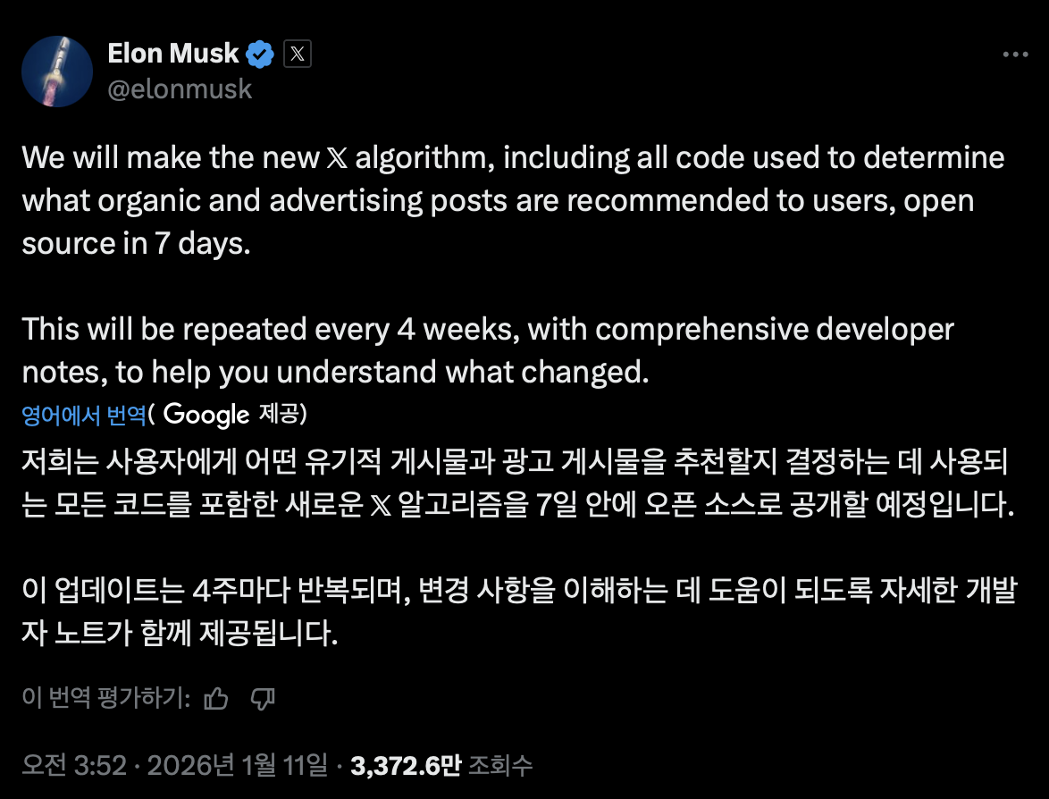 ์์ค(X), ์ถ์ฒ ์๊ณ ๋ฆฌ์ฆ 7์ผ ๋ด ์์ ๊ฐ๋ฐฉ 4์ฃผ ๋จ์ ์์ ์ ๋ฐ์ดํธ ์ฒด์ ๋์