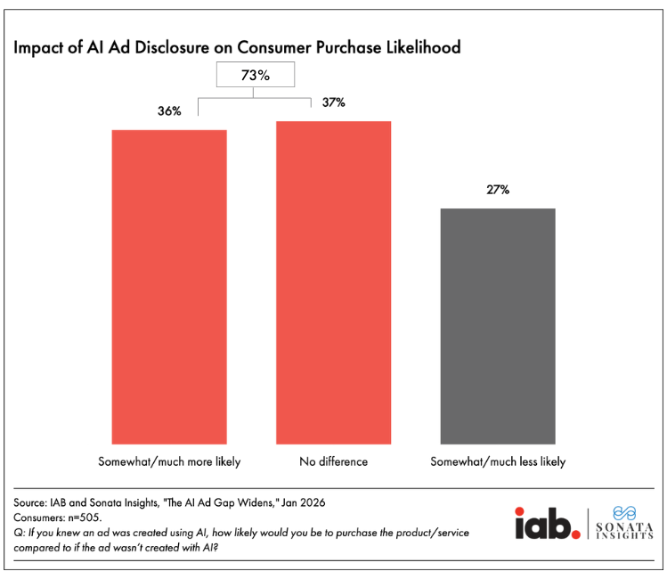 AI๋ก ๋ง๋ ๊ด๊ณ ๋ฅผ ๋ณธ ๊ฒฝํ์ด ์๋ค๋ ์๋น์๋ 71%์๋ค. 2๋ ์ 54%์์ ์๋นํ ๋์ด๋ ์์น๋ค. ๋ฌธ์ ๋ ์ด๋ฐ ๊ด๊ณ ๋ฅผ ์ ํ ์๋น์๋ค์ ์ค์ ๋ฐ์์ด ๊ด๊ณ ์ ๊ณ๊ฐ ๊ธฐ๋ํ๋ ๊ฒ๊ณผ ํฌ๊ฒ ๋ค๋ฅด๋ค๋ ์ ์ด๋ค.