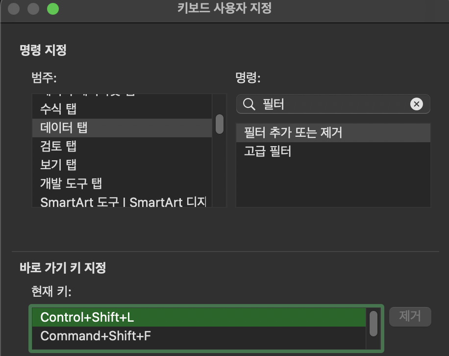 - ํํฐ ์ ์ฉ ๋จ์ถํค : Ctrl + Shift + L